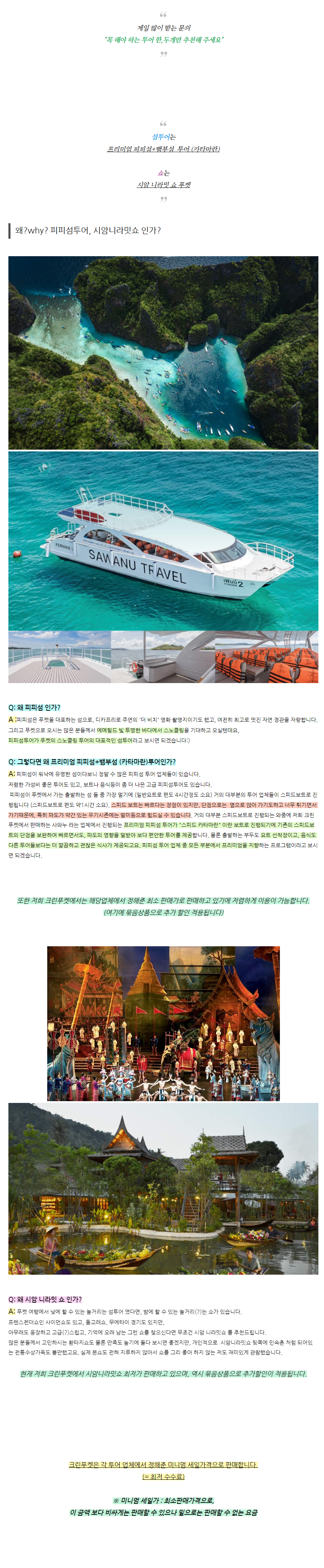 | ※ 마야베이는 태국 정부지침에 따라 8월1일 ~ 9월30일 입장이 금지됩니다. (모든 피피섬 업체 동일 내용) 픽업&샌딩 차량(조인) 프리미엄 피피+뱀부섬(스피드 카타마란 보트) 상품 (이하 피피섬투어) : 푸켓 전지역 무료 입니다. 시암니라밋쇼 : 1인당 350바트 (개별이동시 제외 가능, 인원이 많을 경우 단독차량 유리) 크린푸켓 단독 차량 왕복 2,000바트 (승합차 기준) 아동규정 피피섬투어 : 만 4세이상-11세이하 (아동) 시암니라밋쇼 : 키 100cm~140cm (아동) |