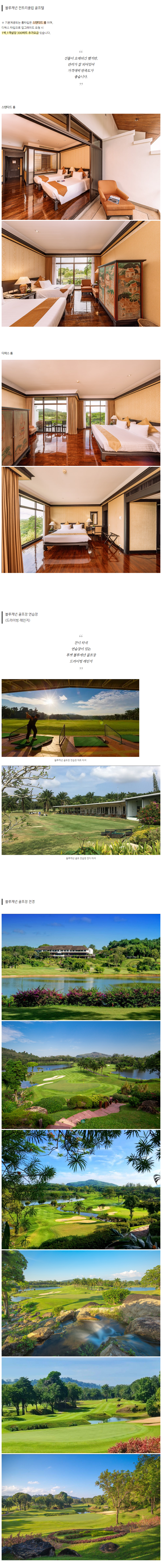 | ※ 위 프로모션은 2박 요금입니다. ※ 블루캐년 스파의 골퍼 마사지 90분 1회가 포함되어있습니다. ※ 위 요금은 1인 요금입니다 ( 라운딩을 하지 않는 non 골퍼를 포함한 경우만 2인 요금 ) ※ 아침 조식은 위 요금에 포함되어 있습니다. ※ 위 요금에는 그린피+카트피+캐디피 가 모두 포함되어 있습니다 (캐디 매너 팁은 불포함) ※ 룸타입은 스탠다드 이며, 디럭스로 업그레이드는 1박당 1방당 1인당 400바트 추가요금있습니다. ※ 체크인 (14:00) / 체크아웃 (12:00) ※ 프로모션 요금으로 취소, 변경이 불가합니다. 우천 시 규정 (우기 시즌 예약 전 필독 사항) 골프장들 규정상 우천으로 인한 취소 및 환불이 불가합니다. 비가 내리는 경우 얼마든지 기다리셨다가 플레이할 수 있지만 당일 취소(환불)나 날짜 변경은 불가합니다. 이점 참고하시어 예약 주시기 바랍니다. ※ 단, 일부 골프장들이 상황에 따라서 레인 체크 쿠폰을 발급해 주는 경우가 있습니다. 사용방법, 기한 등 은 손님께서 수령하실 때 골프장 측으로부터 안내받으셔야 합니다. 레인 체크에 대해서는 여행사에서 관여하지 않습니다. (요청, 확인 불가) |
